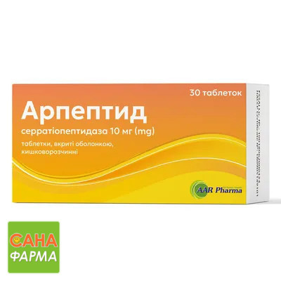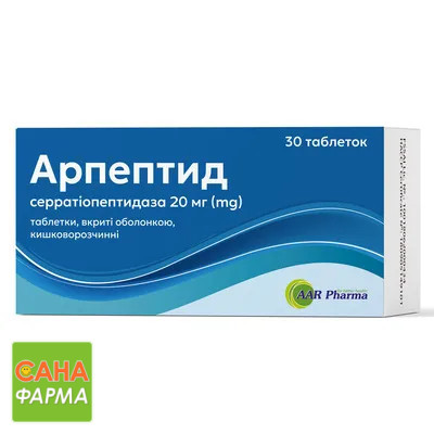 1 таблетка, вкрита оболонкою, кишковорозчинна, містить серратіопептидази 20 мг (mg).