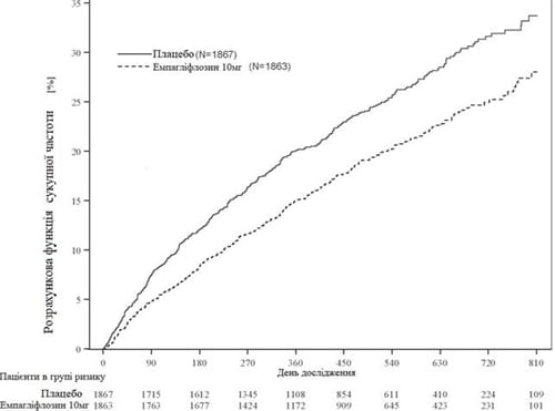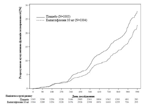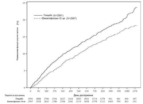 Емпагліфлозин продемонстрував найбільшу ефективність щодо зниження ризику первинної комбінованої кінцевої точки - СС смерті або госпіталізації з приводу серцевої недостатності порівняно з плацебо. Крім того, емпагліфлозин значно знижував ризик ГСН (першої та повторної), а також значно знижував швидкість зменшення рШКФ (Таблиця 2; рис. 2).