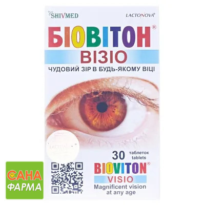 Біовітон Візіо - оригінальна комбінована формула, яка сприяє нормальному функціонуванню зорового апарату, запобігає розвитку дегенерації сітківки, глаукоми, уповільнює розвиток катаракти і зниження гостроти зору, пов'язаних з віковими змінами.