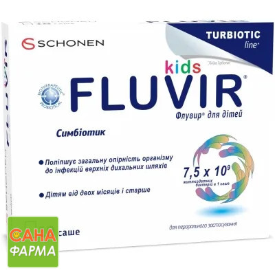 Флувир® для дітей - це симбіотик, що містить п'ять пробіотичних бактерій Lactobacillus plantarum LP01 та LP02, Lactobacillus rhamnosus LR04 та LR05, Bifidobacterium lactis BS01 та пребіотик - фруктоолігосахариди.