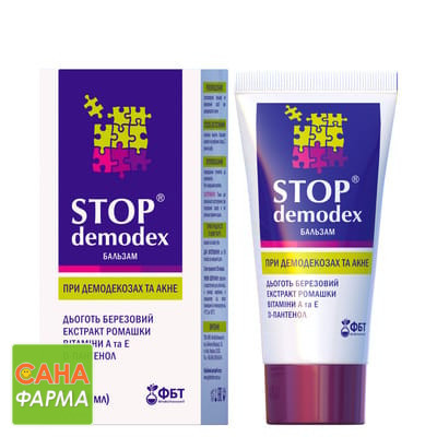 Бальзам Стоп Демодекс / Stop Demodex® для комплексного лікування або профілактики повторного прояву демодекозу і акне. Ефективно впливає на саму причину захворювання - підшкірне розмноження кліща. Володіє сильними протизапальними і відновними властивостями - досить швидко прибирає симптоми захворювань. Після застосування препарату вже після декількох днів спостерігається очищення шкіри від вогнищ захворювання.
